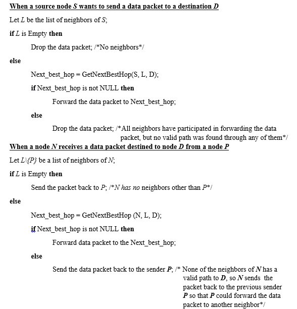 This table helps picking best neighbor for forwarding packets to the destination. For that purpose, when a node receives a data packet, it stores the information about the packet in its Seen Table. As shown in Table 1, each record of this table contains five fields namely, neighbor ID (NbrID), source address (Src), destination address (Dst), flag (Flag), and lifetime (Lifetime). is the address of the neighboring node that has sent the packet, forwarded the packets, or the node from which the packet has backtracked. contains the address of the source node that generated the data packet. indicates whether the received packet is a new packet (i.e., forwarding mode) or it has backtracked from a neighboring node (i.e., backtracking mode). The flag is set to when the packet is in forwarding mode and set to when it has backtracked. The lifetime field specifies the lifetime of the associated record in the Seen Table. When a node receives a data packet, it creates an entry in its Seen Table if the packet is new. However, if it has received a data packet with the same source and destination addresses from the same neighboring node, then it updates the lifetime of the associated record. On the other hand, when the lifetime expires, the associated record is removed from the table.