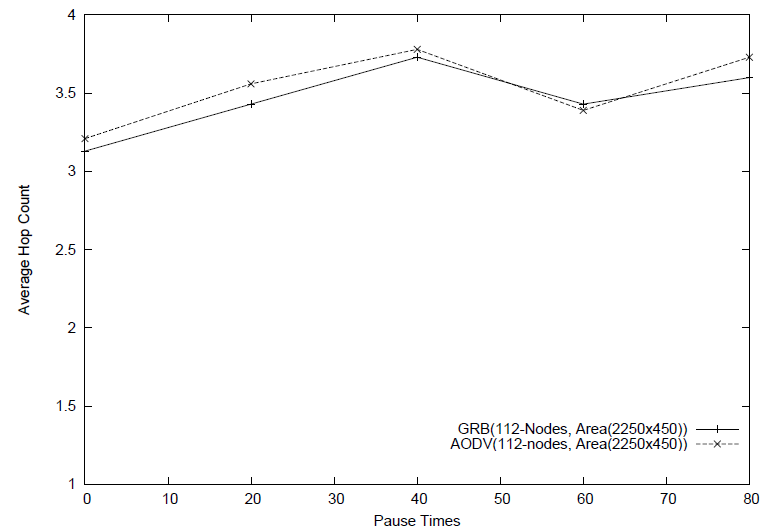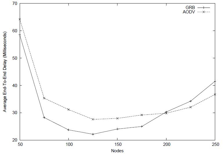 Since our protocol uses only information about neighbors in forwarding decision, as node density increases, GRB keeps delivering higher fraction of data packets than AODV and DSR as shown in Figures 15 and 15. That is because both AODV and DSR depend on end-to-end route to forward data packets and that route is affected by mobility of the nodes and the size of the network. Hence due to mobility, more frequent link breaks occur leading to more route repair and setup and as a result, packets are lost more frequently. However, since the average end-to-end delay is taken only for packets that are delivered to their destinations and because data packets follow existing routes which decreases waiting time, AODV routes data packets in slightly less time than GRB when number of nodes grows to more than 200 as shown in Figure 17. However, GRB is faster in smaller networks (less density) because less computation required by nodes to make forwarding decisions since nodes have less neighbors. Average hop count is another parameter that we measure in this simulation to show that our protocol routes data packets with less number of hops as node density increases. For this metric, only the successfully delivered data packets are counted in the simulation results for both GRB and AODV. As shown in Figure 17, in smaller networks (i.e., less than 150 nodes), AODV uses less number of hops to forward data packets than GRB because there are more voids in sparse networks. This makes GRB data packets to go around voids through either next best hop or backtracking technique which makes GRB packets traverse more hops than AODV. However, as number of nodes increases, number of voids decreases and data packets move through greedy paths, hence GRB uses less number of hops than AODV in dense networks. It is worth to mentioning that under GRB, average hop count is also reduced because next hop is chosen greedily.
