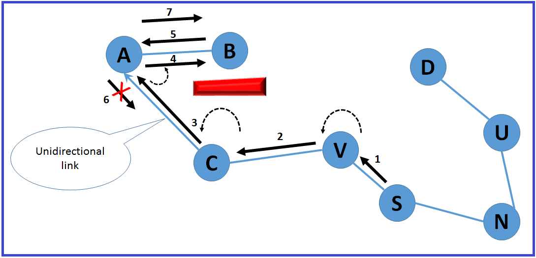 As shown in Figure 2, a unidirectional link can cause an infinite loop during face traversal. In this example, when the source node needs to send data packets to the destination node , based on greedy forwarding, it sends that data packet to node . Node is a dead end for that packet, hence it switches to face routing and forwards the data packets to node . In this case, when constructs the planar graph of the local network using , it cannot see the witness in the circle whose diameter is the distance between and because of the obstacle shown in Figure 2. Therefore, generates a link to node . However, node does not create a link to node in its local graph because it can see the witness in the circle. Therefore, node can forward the data packets to node which in turn forwards them to node and based on face routing, node returns the packet to node . Since node does not have a link to node in the local graph, it returns the packets to node and as a result, the data packets loop.