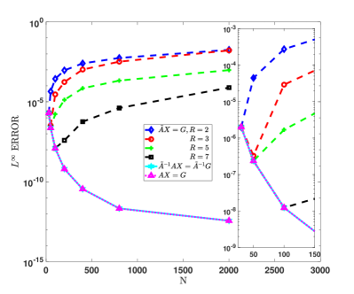 By using H-LU decomposition, we reduce the computation cost to for solving the system (28). However, it is at the cost of losing accuracy and the system is ill-conditioned. Next, we solve the original system (8) by using the H-matrix approximation system (28) as a preconditioner. More precisely, we solve the following preconditioned system