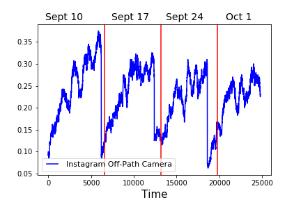 Cyber-physical systems: In Fig. 1, we have plotted the average number of Instagram messages posted near three CCTV cameras in New York City (NYC). These counts were extracted from multi-modal traffic data (CCTV images, Twitter and Instagram messages) that we collected in NYC [32], [33]. We collected data during a 5K run that occurred on September 24, 2017. We also collected data on two Sundays before and one Sunday after the event day. The first two plots in Fig. 1 are for two CCTV cameras that were not on the path of the 5K run while the third figure contains data corresponding to a camera on the path of the run. As can be observed from the figures, the average message counts show similar statistical behavior on the four Sundays for the off-path cameras. For the on-path camera, the average message count increases due to the event. This periodic pattern was also observed in other data that we collected in [32] and [33]. Thus, the problem of anomaly detection or change detection in traffic data can be posed as the problem of detecting deviations away from statistically periodic behavior.