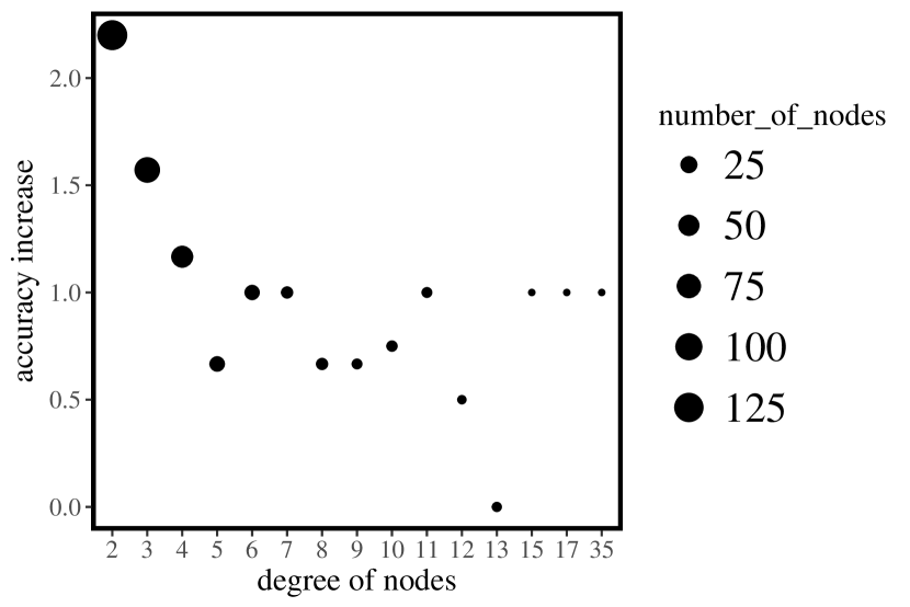 Next, we are discussing how accuracy increasing for different methods. We use the Citeseer dataset as an example. Figure 7(a) 7(b) 7(c) show accuracy improvement for single node attacks, and Figure 7(d) 7(e) 7(f) is for attacking groups of 100 nodes. Our method not only keeps the higher degree nodes accuracy but also boost the lower degree ones. When comparing attacking groups of nodes and attacking single node, we find there our GraphDefense method results stay inconstant for different kinds of attacks, and the accuracy for degree 2 nodes improved by 6X for attacking groups nodes compared with 3X for attacking single node. While for the other 2 methods, the accuracy drops in some larger degree nodes for attacking groups of 100 nodes.