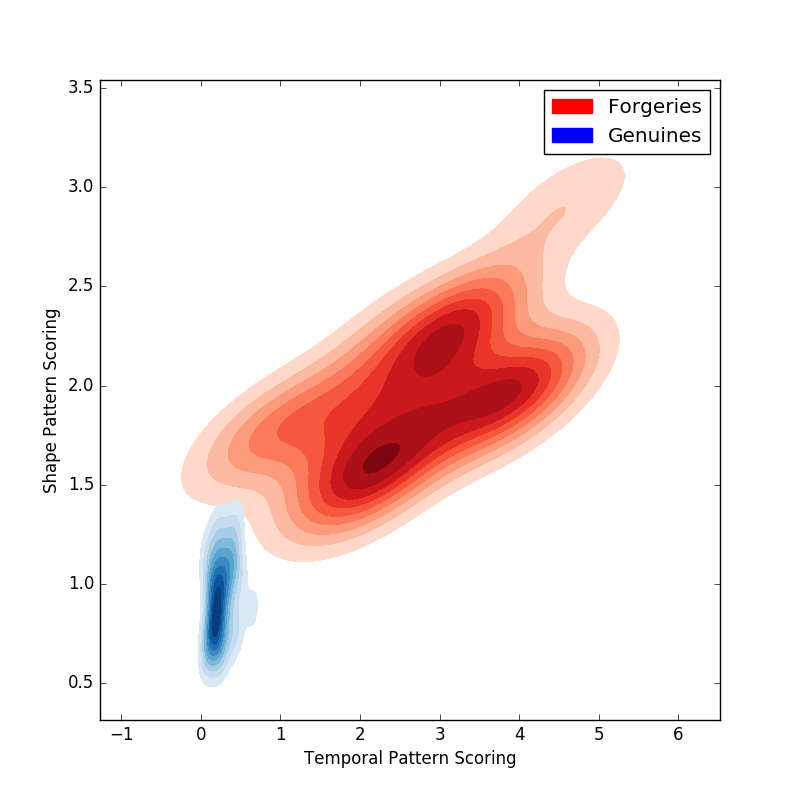 In Fig. 2, bottom sub-figure, we show the 2D distributions corresponding to the dissimilarity scores, with the temporal dissimilarity in the x-axis and the shape dissimilarity in the y-axis. One can notice that, for the legitimate signatures (blue, cyan cluster), this 2D distribution is much more compact than it is for the 2D distribution associated to forgeries (red cluster). Furthermore, on this example, using the two dissimilarity scores jointly enable us to find a better separating hyperplane between the two clusters comparatively to the case where only one of the two scores is considered.