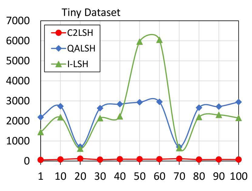 The goal of our paper is to present a detailed analysis of the performance of the state-of-the-art LSH techniques. We also compare the accuracy of these algorithms. We randomly choose 50 queries from the dataset and report the average of the results of these 50 queries. We used the same parameters suggested in their papers ( for QALSH and for C2LSH). We choose and (since C2LSH cannot give guarantees for ). Since our goal is to present the performance analysis of query processing, we do not compare the index time and index construction time of these three algorithms. Since I-LSH uses the same hash functions as QALSH, their index size and index construction time are the same. [10] shows the difference between these two criteria for C2LSH and QALSH for different datasets, and hence we avoid it in this paper.