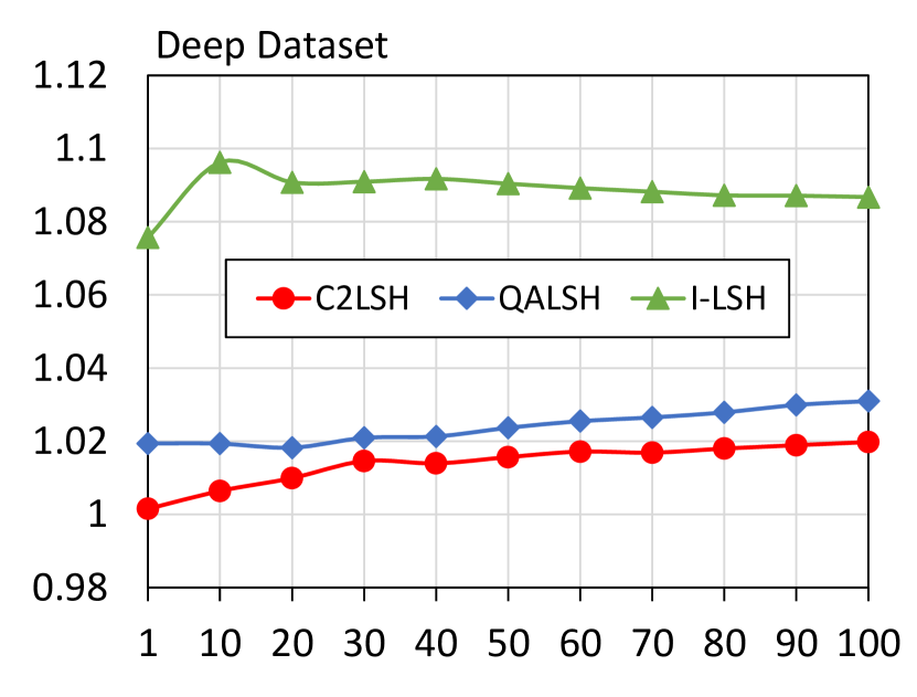 Accuracy Ratio: Figure 6 shows the accuracy of the compared techniques. Having a ratio equal to 1 equates to highest accuracy. Except for the Mnist dataset, C2LSH produces the best accuracy among the three algorithms. QALSH is more accurate than I-LSH, which we believe is mainly because it uses more hash functions than I-LSH. Except for C2LSHβs accuracy on the Mnist dataset, all three algorithms produce accurate results for all datasets.