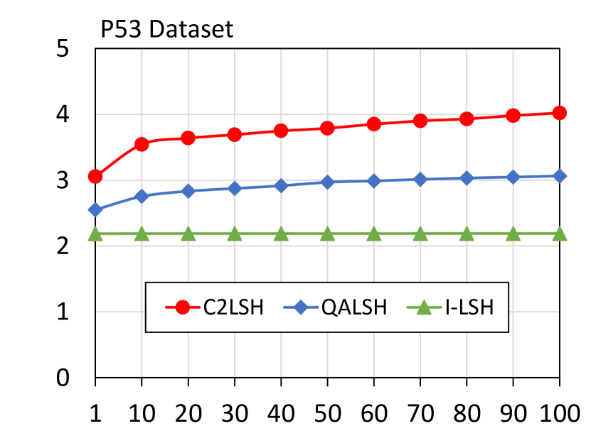 Algorithm Time: Figure 3 shows the time needed by an algorithm to find the candidates (excluding the I/O times). This figure shows the huge overhead of I-LSH which is caused due to their incremental searching for the nearest projected neighbors. Also, since I-LSH and QALSH both use B+-trees, which become huge for the larger datasets, their performance degrades heavily in these cases while searching for candidates. Since C2LSH does not have any overhead of additional index structures (such as B+-tree), it has the least Algorithm time for all datasets. In terms of Algorithm Time, I-LSH is faster than QALSH (except for the P53 dataset - which is the smallest dataset in our experiments) mainly because it has to process less hash functions than QALSH [16].