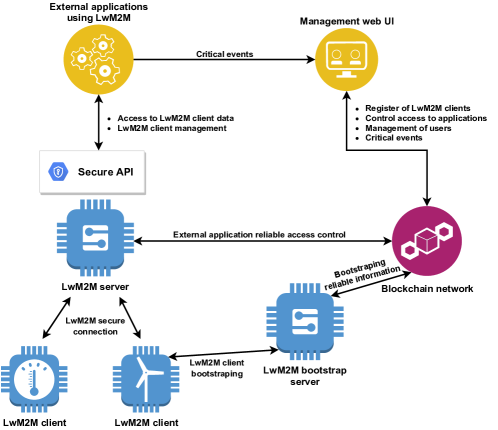 Different applications and users can securely interact with the LwM2M devices deployed in the system. These interactions are carried out through the secure API that LwM2M servers expose. Before that, an authentication process is required where applications and users are verified with their credentials through Blockchain technology.