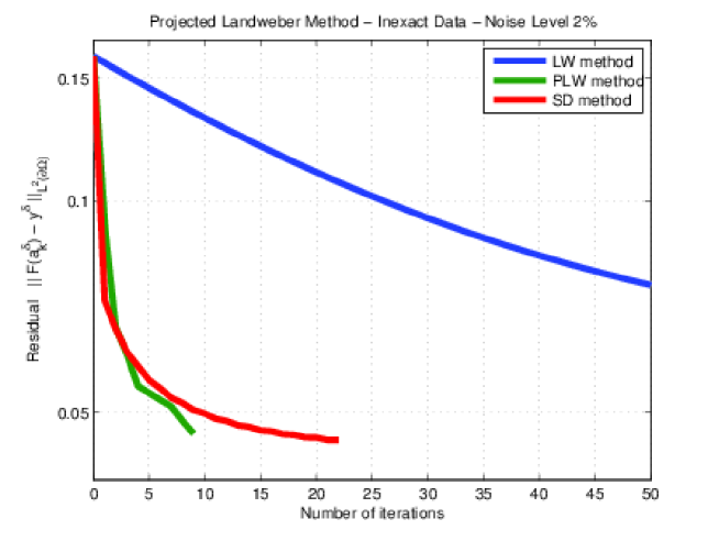 In our numerical experiments, the residue in the PLW method has very strong oscillations for noisy data (Fig…) and for exact data (Fig.) Since this method iterations’ aims to reduce the iteration error, a non-monotone behavior of the residual is to be expected. In ill-posed problem error and residual are poor correlated, which may explain the large variations on the second one observed in our experiments with the PLW. Up to now it is not clear to us why this non-monotonicity happened to be oscillatory in our experiments.