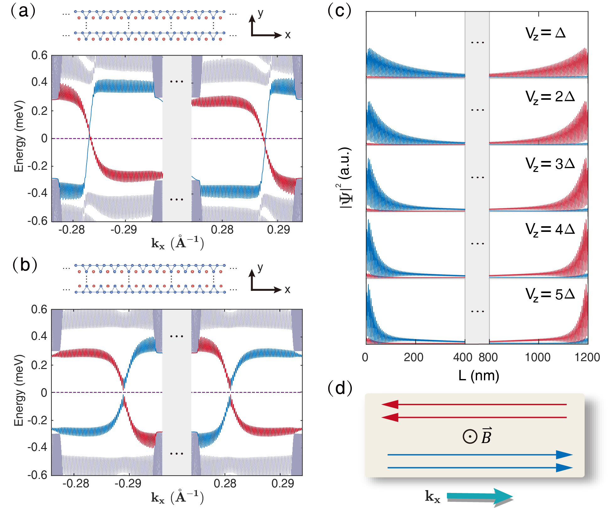 In our present calculations, the chiral Majorana edge modes possess noticeable oscillations that can be attributed to strong finite size effects Zhou et al. (2008); Wada et al. (2011). In Fig. 3(c), we plot the real-space distributions of these edge states at the zero-energy intersection point kx=0.288Å in Fig. 3(b). As expected, the states from the two edges are symmetric due to in-plane inversion symmetry and decrease exponentially into the bulk. Moreover, the penetration length of these chiral edge states defined by real-space distribution decreases with increasing , pointing to the more localized zero-energy edge modes for larger . In comparison to the earlier reports based on proximity effectsQi et al. (2010), edge modes in our system are more dispersive in real space due to the smaller superconducting gap. Based on the above results, a schematic diagram that emphasizes the two zero-energy chiral Majorana edge modes in Pb3Bi/Ge(111) is depicted in Fig. 3(d).