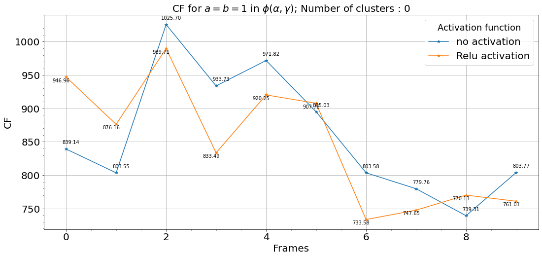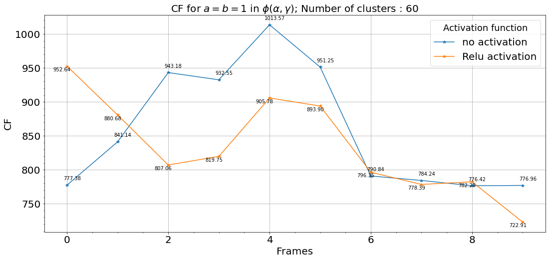 We also observed that the activation function does not assist in prediction rather negatively affects the performance. The same keypoint can be highlighted from the Fig9. Since the image-size, we chose for this experiment set was 60, a decrease in CF score post frame is observed as for the possible reason explained above. Fig-10 highlights the idea that a higher number of filters improve performance. However, we have not tested for the convergence limit where on further increasing the number of filters, the performance stops increasing. Fig-11 bolsters this idea as the rapid fall in loss function for filters is close to 400-500 epochs. One of the advantages of using CF as the metric can be highlighted in Fig-12, which highlights that filters outperform 30 filters for image-size 60. Thus, the loss function is not the sole measure of performance. Fig-14 validates the idea that was stacking ConvLSTM layers improve the performance with Fig-13 validating the idea that 0 and 60 clusters outperform lower clusters. Fig-15, Fig-16 bolsters the same key point.