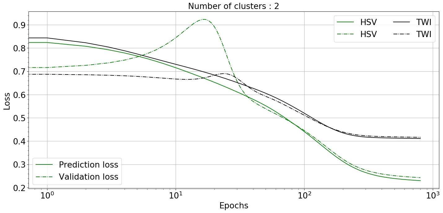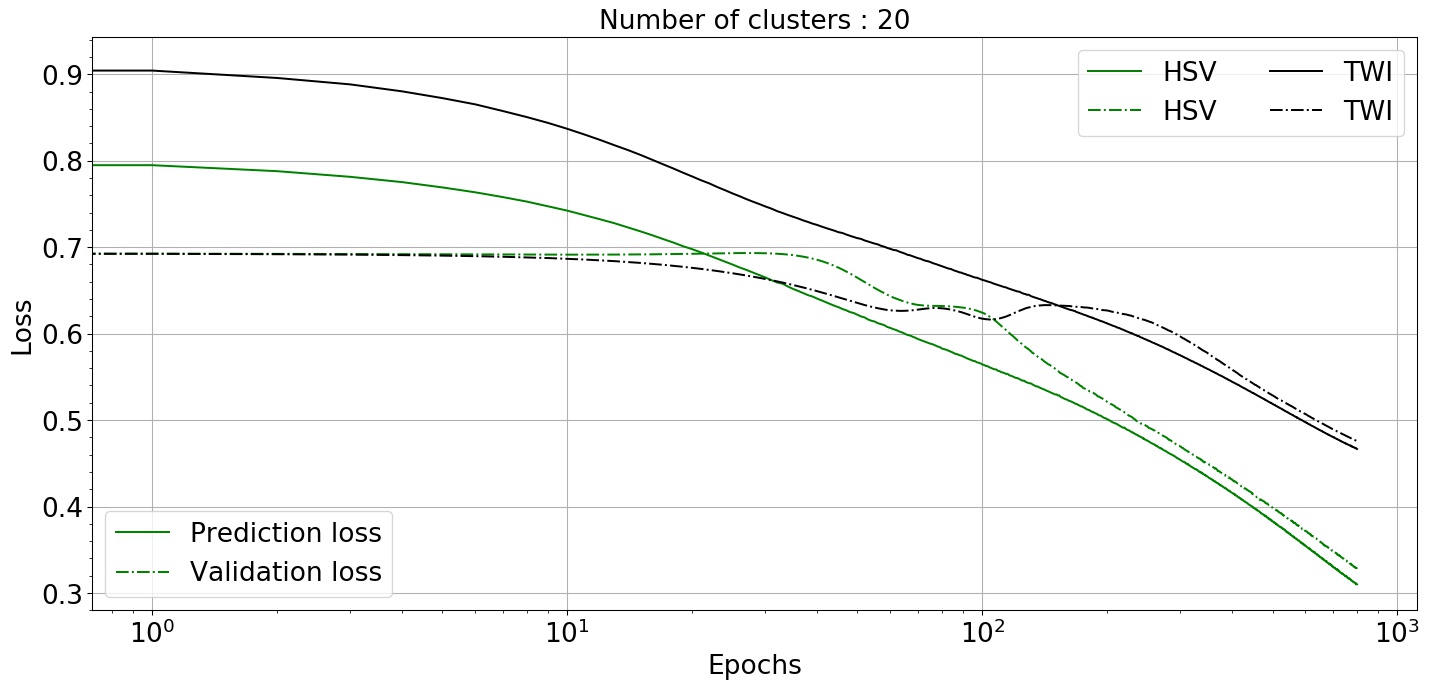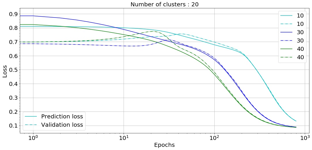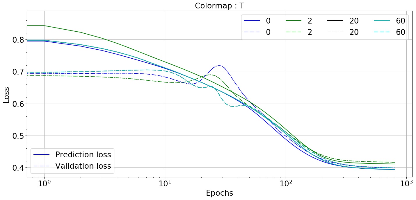 In this section, we explain our results and the notable observations for the datasets, as mentioned in Sec-4 and the varying parameters as compiled in Table-3. In dataset-1 (4.1) from Fig-6 we can observe that the loss function decreases rapidly for all the image-size once number of epochs are close to and converges after crossing epochs. We also observed that the clustering has a significant effect, and a more stable solution was achieved when the number of clusters was 60 or 0. Thus, from our experiments, we concluded that the reduction in the number of clusters did not assisted towards accelerating the accuracy. A plausible explanation can be that the DL learning model predicts various pixel values corresponding to the input frames and attempts to mimic them, reduction in the number of clusters, which is another way of reducing the spread of the pixel values, results in a larger difference between the ground-truth-frame and the predicted frame. We can also observe a general trend with validation loss, which tends to increase and peaks between and then maintains a similar gradient as that of prediction loss. Although less prominent for image-size 60, it is clearly visible for the other two image-sizes: 80 and 120.