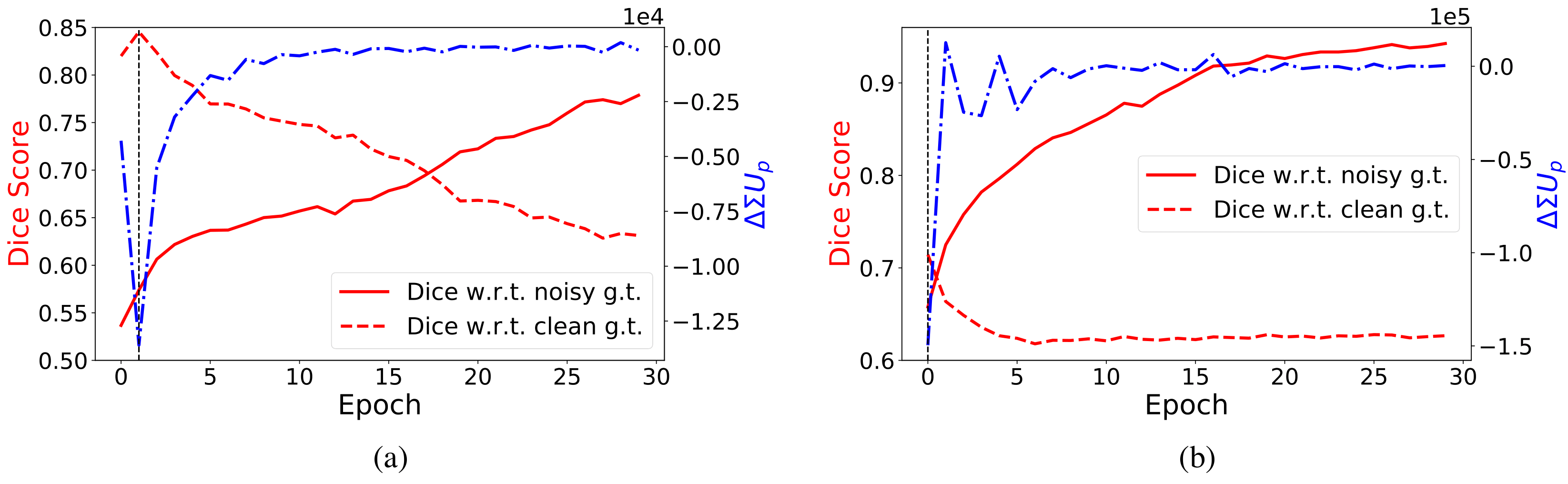 The graph of is shown in Figure 4 (a) and (b) by the blue curves. We argue that in the absence of data that is guaranteed to be clean, a possible indicator of the epoch suitable for relabeling could be the point when the speed at which the mean cumulative uncertainty decreases is at its maximum (in other words, when reaches its minimum). These epochs are indicated by vertical lines in Figure 4. At this moment, the network has already learned enough to be highly uncertain mostly in the regions of noisy boundaries. When the network starts overfitting to noise, goes to zero. For both datasets, the epoch indicated by this minimum in coincides with the epoch when the segmentation accuracy measured with respect to the clean test data reaches a maximum before dropping if there is no noise correction.