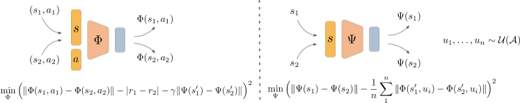 Building upon the insights of the previous sections, we derive an approximate version of the iterative scheme, to estimate a near-optimal pseudometric . Pairs of transitions are assumed to be sampled from a fixed dataset . We use Siamese neural networks (Bromley et al., 1994) to derive an approximate version of a pseudometric . Using Siamese networks to learn a pseudometric (Castro, 2020) is natural since it respects the actual definition of a pseudometric by design (Definition 1). To ease notations, we conflate the definition of the deep network with its parameters. We define the pseudometric as: