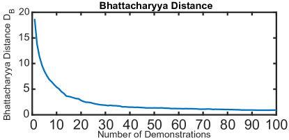 The previously described indicators are computed each time a new demonstration is added to the ProMP. Fig. 4 shows all four indicators plotted over the course of training. The Bhattacharyya distances reach an almost steady level after around 40 demonstrations. The relative errors computed from the Frobenius norms reach near steady levels immediately for the mean and after about 15 demonstrations for the covariance .
