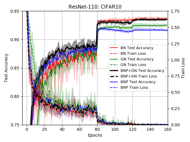ResNets: For the ResNet-110 experiments on CIFAR datasets, we follow the settings of (He et al., 2016a, b). For all models, we use the data augmentation as in He et al. (2016a) and use the momentum optimizer with momentum set to 0.9. We implement all parameter settings suggested in He et al. (2016a) for BN, with the exception that Preactivation ResNet-110 for CIFAR-100 follows the learning rate decay suggested in Han et al. (2016). These include weight regularization of and a learning rate warmup with initial learning rate increasing to after 400 iterations. For networks with GN, we follow Wu and He (2018) and replace all BN layers with GN. We use group size 4. For BNP+GN with CIFAR10, we use weight regularization of , the He-Normal weight initialization scaled by 0.1, and group size 4 in GN. For BNP+GN with CIFAR100, we use weight regularization of , the He-Normal weight initialization scaled by 0.4, and group size 4. GN and BNP+GN use a linear warmup schedule, with initial learning rate increasing to over 1 or 2 epochs, tuned for each network.