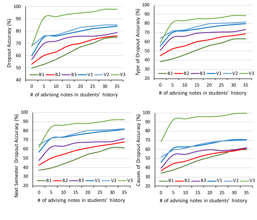 Fig. 2 illustrates the changes of accuracies over the number of availability of each student’s advising note while predicting their retention risks (five different tasks) which clearly shows that different versions of our method (V1, V2 and V3) outperform baseline methods significantly in any number of advising notes’ availability. Also, it can be clearly stated that, the prediction accuracy of each task increases as the number of available advising notes increases for each student in the testing data. Fig 3 illustrates the prediction accuracies of individual dropout cause (15 dropout causes) using our proposed model, where we can see that (we removed cause ”Own Death with index 7” due to ethical reason), predicting dropout due to financial condition, family reason, marriage related, struggling with grades, COVID-19 related financial, COVID-19 related struggling in attending online classes and mentally ill, are extremely accurate (95%+). However, it has been extremely difficult to predict physical illness, death of family member and personal problem related college dropout from the educational data.