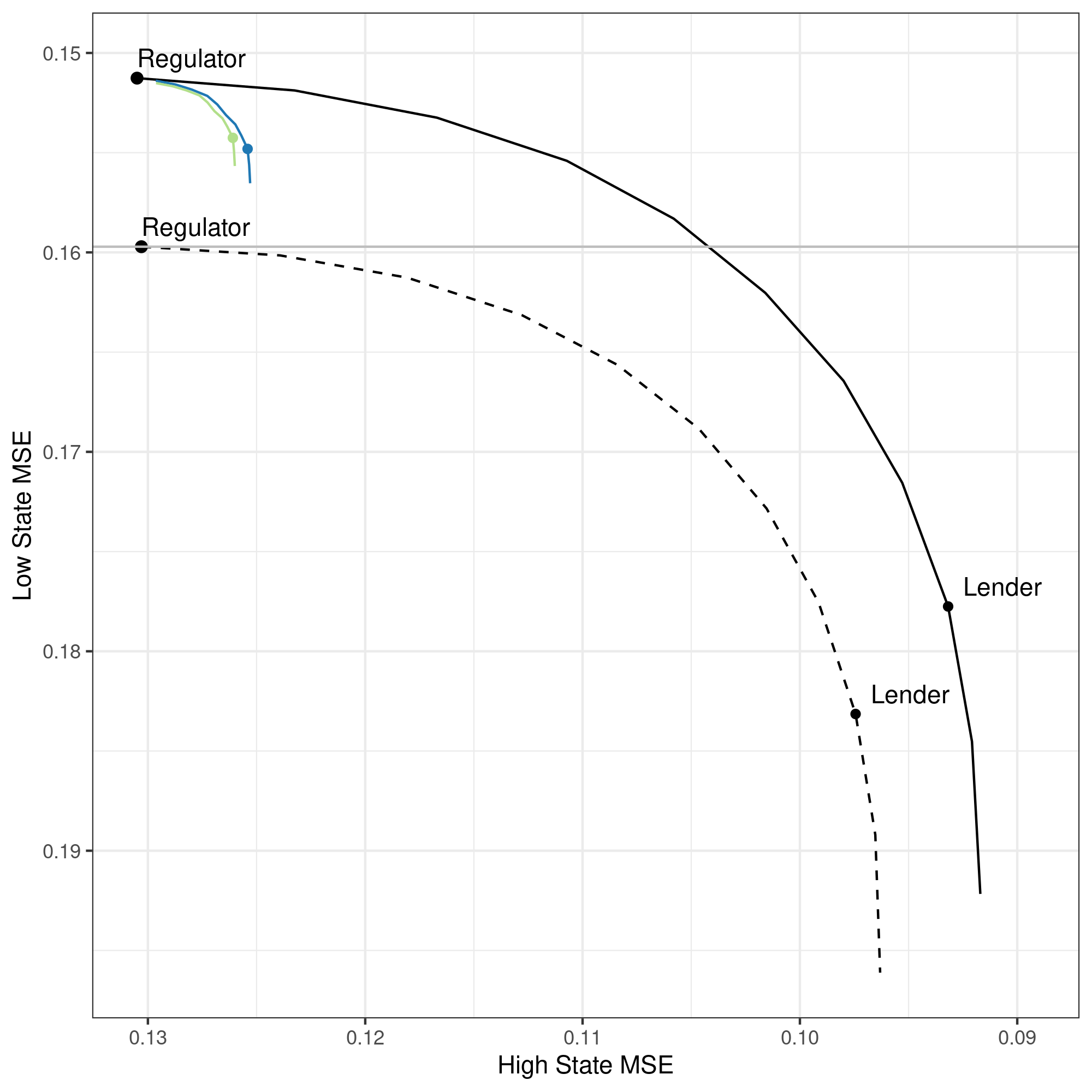 A financial regulator oversees the credit provision of a lender. The lender aims to maximize overall expected utility from credit scoring, while the regulator cares about the potential downside in a bad state of the economy, . In that (rare) bad state, the regulator assumes that the probability of repayment may be lower for applicants with the same credit file than their repayment probability in the (more common) good state, leading to excess risk taken on by the lender. Here, we assume that the future state is not known at the time of credit scoring, so the different preferences of the lender and the regulator represent different trade-offs between the good and the bad states of the economy.