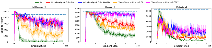 Algorithm Implementation. Our implementation of ValueDice and DAC follows the public repository https://github.com/google-research/google-research/tree/master/value_dice by Kostrikov et al. [2020]. Our implementation of BC is different from the one in this repository. In particular, Kostrikov et al. [2020] implemented BC with a Gaussian policy with trainable mean and covariance as in [Kostrikov et al., 2020, Figure 4]. However, we observe that the performance of this implementation is very poor because the mean and covariance share the same hidden layers and the covariance affects the log-likelihood estimation. Instead, we use a simple MLP architecture without the output of the covariance. This deterministic policy is trained with mean-square-error (MSE):
