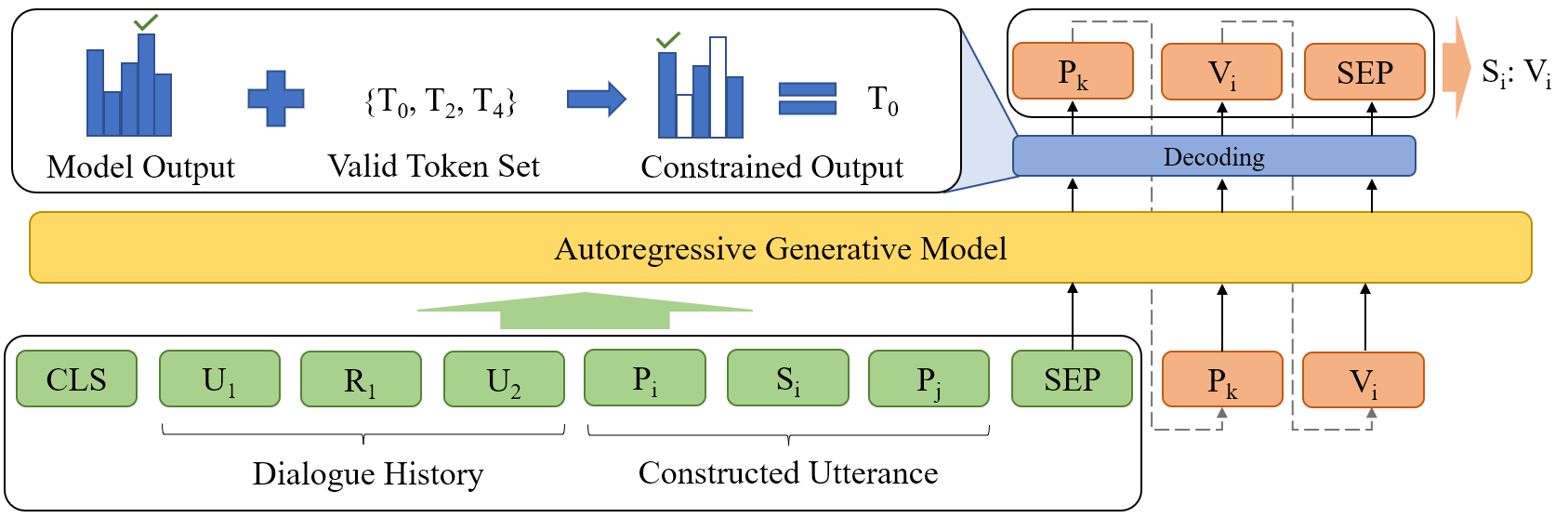 In this work, we treat the DST task as a Seq2seq task using a generative model. As shown in Figure 1, we use prompt token to transform the target (intent or slot type) and their value into a series of dialogue-style question-answer pair . By using to generate , we convert the DST task into a response generation task. This makes it possible to pretrain the model with unlabeled dialogue datasets. The result of the DST task is acquired by parsing the generated output utterance. An extra decoding algorithm is used to guarantee the utterance is well-formed.