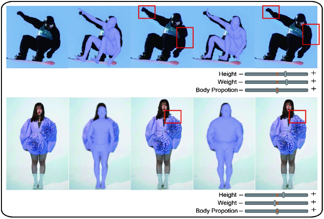 We create an easy-to-use interface for semantic reshaping of human bodies by offering users a set of sliders corresponding to the aforementioned semantic attributes (Fig. 3), and the users can get reshaping results instantly after adjusting. Specifically, we pick four key shape parameters which separately represent the height, weight, leg girth, and body proportion for simple usage. Note that, increasing the body proportion indicates the lengthening of legs while keeping the height unchanged, and vice versa. We also allow users to pick a particular subject by drawing a bounding box before the 3D fitting, if multiple people exist in a source image.