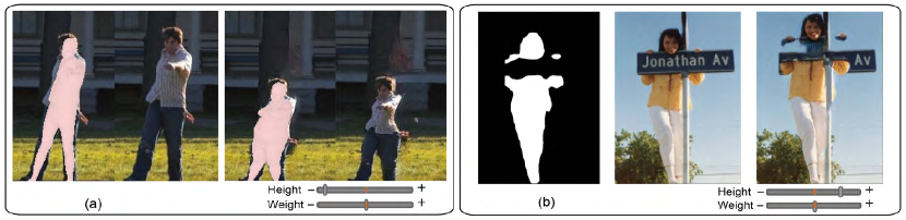 In this section, we compare our approach to the direct warping method, the warping-based human reshaping method [24], the state-of-the-art human image editing method [14] using deep learning and the state-of-the-art human reshaping method [19].