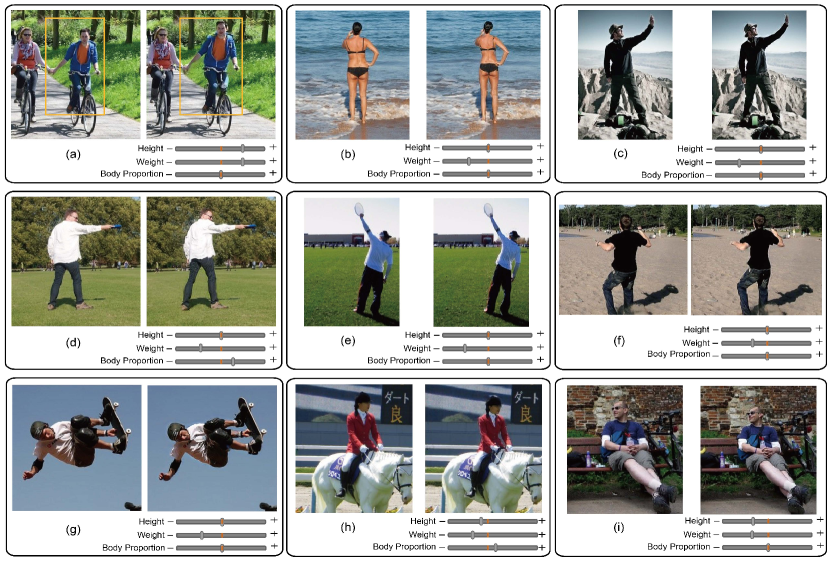 Semantic retouching of human bodies in images, such as increasing the height and slimming the body, has been long desired. However, the problem is essentially ill-posed because one should anticipate a set of articulated and nonrigid deformations of different body parts, given that the deformations are inherently three-dimensional. This situation becomes more complicated when images are captured in unrestricted environments with occlusions, and complex interactions between the human body and its surroundings. Early attempts [24] have attempted to address this issue by interactively fitting a 3D parametric human model to human bodies in images and allowing the fitted 3D model to delegate the transformation via image warping. Although compelling results are produced, these methods may suffer from laborious interactions and foreground and background distortions.