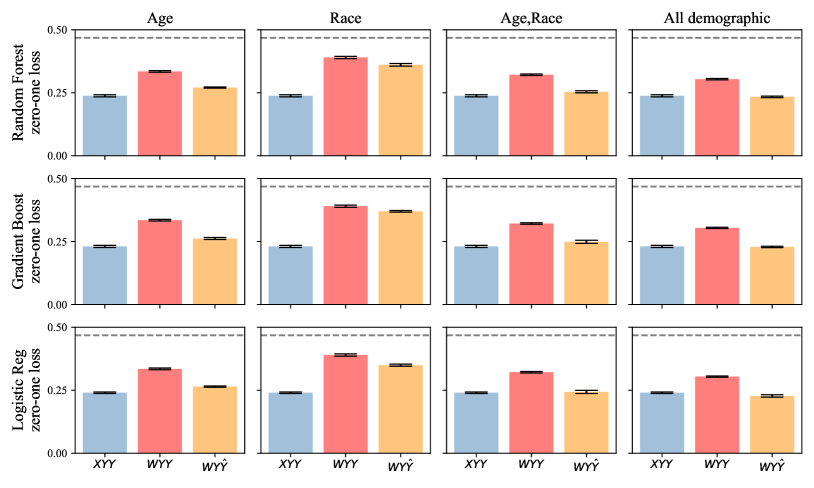 We consider Wave 1 and Wave 2 of the SIPP 2014 panel data. The target variable is based on the official poverty measure (OPM), a cash-income based measure of poverty. We compute this measure based on Wave 2 data. We again discretize the measure to obtain to roughly balanced classes for our binary prediction task. The goal is to predict this outcome based on features collected in Wave 1. After cleaning and preprocessing our data contains 39720 rows and 54 columns. We consider background variables education, race, education and race together, as well as all demographic variables, specifically, age, gender, race, education, marital status, citizenship status. In Figure 3, we restrict our attention to the logistic regression model. The other models perform similarly and the full set of results can be found in Appendix C.