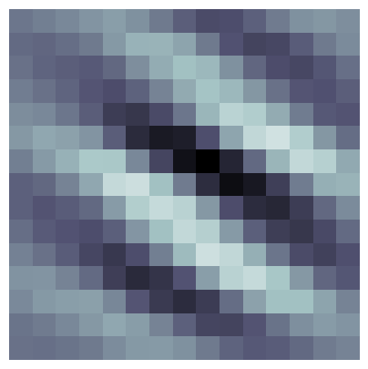 We can observe that many kernels display oscillating patterns with well-defined orientations (Gabor-like filters). We denote by one of these “well-behaved” filters. Its Fourier spectrum roughly consists in two bright spots which are symmetric with respect to the origin.111 Actually, the Fourier transform of any real-valued sequence is centrally symmetric: . The specificity of well-oriented filters lies in the concentration of their power spectrum around two precise locations. Now, we consider a complex-valued companion such that