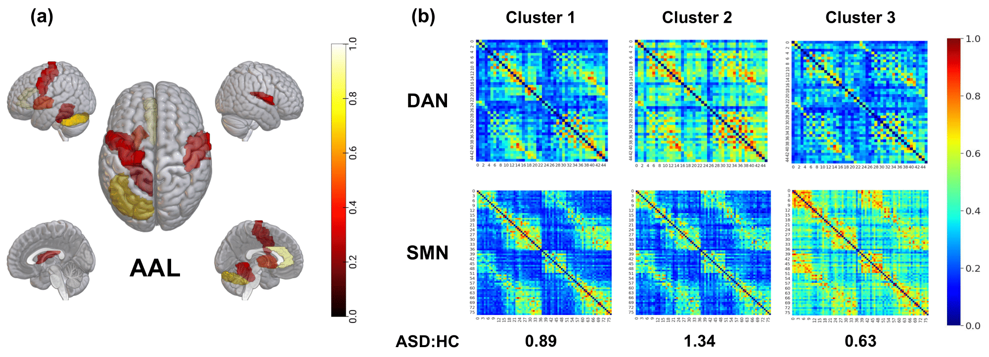 In analyzing the temporal attention results, we use -means clustering to group the dFC information of all subjects. We effectively partition the set of fMRI timeseries into “brain activity states.” Following the methods of [31], we take the set of all attended timepoints such that each attended timepoint is at least one standard deviation greater than the average temporal attention score across each layer, and we set the number of clusters to 3. Removing the unattended timepoints from each subject’s sequence of dFC , we assign each subject to their closest cluster. Using the temporal attention scores from the Schaefer atlas, we examine the temporal states of the Dorsal Attention Network (DAN) and Somatomotor Network (SMN) in particular. We calculate the ratio of ASD subjects to healthy controls (HC) assigned to each cluster. It can be observed in Figure 2(b) that for the clusters in which there is hyperactivity in the DAN compared to the SMN, the ratio of ASD to HC is significantly greater than one (1.34). Conversely, when there is hypoactivity in the DAN compared to the SMN, the ratio of ASD to HC is less than one (0.63). This validates previous findings that discovered significant underconnectivity in sensorimotor regions and heightened connectivity in prefrontal and parietal regions among subjects with ASD [1, 2].