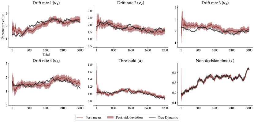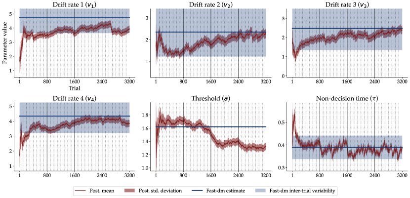 We fitted a non-stationary DDM with a Gaussian random walk transition model to each individual in the data set separately. The model implementation was the same as in the Stan Benchmark and the Simulation Study. For the training of our neural estimation method we used epoch each consisting of iteration with a batch size of . After training we obtained posterior samples.