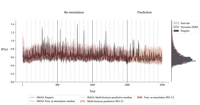 The left panel of Figure 7 depicts the empirical RT time series data of an individual participant in black (Figures for the remaining participants are available in the Appendix). To evaluate whether the non-stationary DDM is capable of capturing the empirical data, we perform posterior re-simulations on the first blocks of the experiment (trials ). To this end, we draw samples from the posterior distributions over to simulate posterior-re-simulated data sets. The resulting RT time series are then summarized with the median and the credibility interval (CI) across simulations and depicted in red color. We smooth the trial-by-trial empirical data and model outputs via a simple moving average (SMA) with a period of to ease visual inspection of potential trends. Note, that the re-simulation from the fast-dm model is only shown in the marginal RT distribution on the right panel to avoid visual clutter.