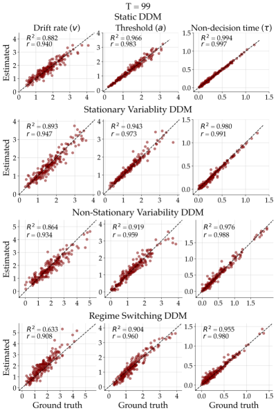 Next, we probe the parameter recoverability of a non-stationary DDM under different induced misspecifications (i.e., models that differ from the one used for training the network). To this end, we performed an extensive study for which we simulated data sets consisting of time points in four different scenarios: i) A static DDM with constant parameters; ii) a DDM with stationary variability (commonly referred to as “inter-trial variability”) where the 3 DDM parameter fluctuate randomly around a constant value; iii) a non-stationary DDM with a Gaussian random walk transition model; iv) and a DDM with constant parameters that jump abruptly and uniformly at three predefined time points (i.e., a regime switching model). Crucially, we trained the neural approximator only with simulations from the non-stationary model. However, during amortized inference, we applied the network to data sets from each of the four scenarios. Thus, we could investigate the network’s response in the open world setting where the true data generator may differ from the reference model used during the training phase.