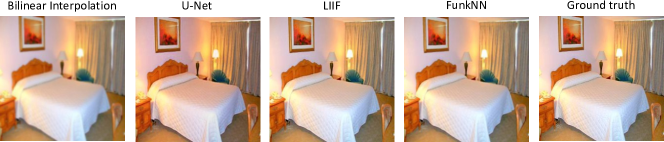 One exciting aspect of the proposed model is its strong generalization to out-of-distribution (OOD) data–a boon obtained from FunkNN’s patch-based operation. We showcase it by evaluating FunkNN originally trained on CelebA-HQ (Karras et al., 2017) at resolution 128128 (Section 5.1), to super-resolve images from the LSUN-bedroom (Yu et al., 2015) dataset which are structurally very different from the training data. Moreover, we super-resolve images from size 128 to 256, which were not seen at training time. Figure 5 indicates that the proposed model can faithfully super-resolve OOD images at new resolutions. We compare our approach with U-Net (Ronneberger et al., 2015) which has shown promising results for super-resolution; however, it can only be trained to map between two fixed resolutions. We trained a U-Net to superresolve from to ; it was thus trained on larger images than other methods. Nevertheless, Table 1 shows that while the U-Net performs well on inlier samples, it gives rather bad results for OOD data. We also report the shift-invariant SNRs (Weiss et al., 2019) in Table 2 to compensate for the fact that U-Net is unable to recover the correct amplitudes for OOD samples.