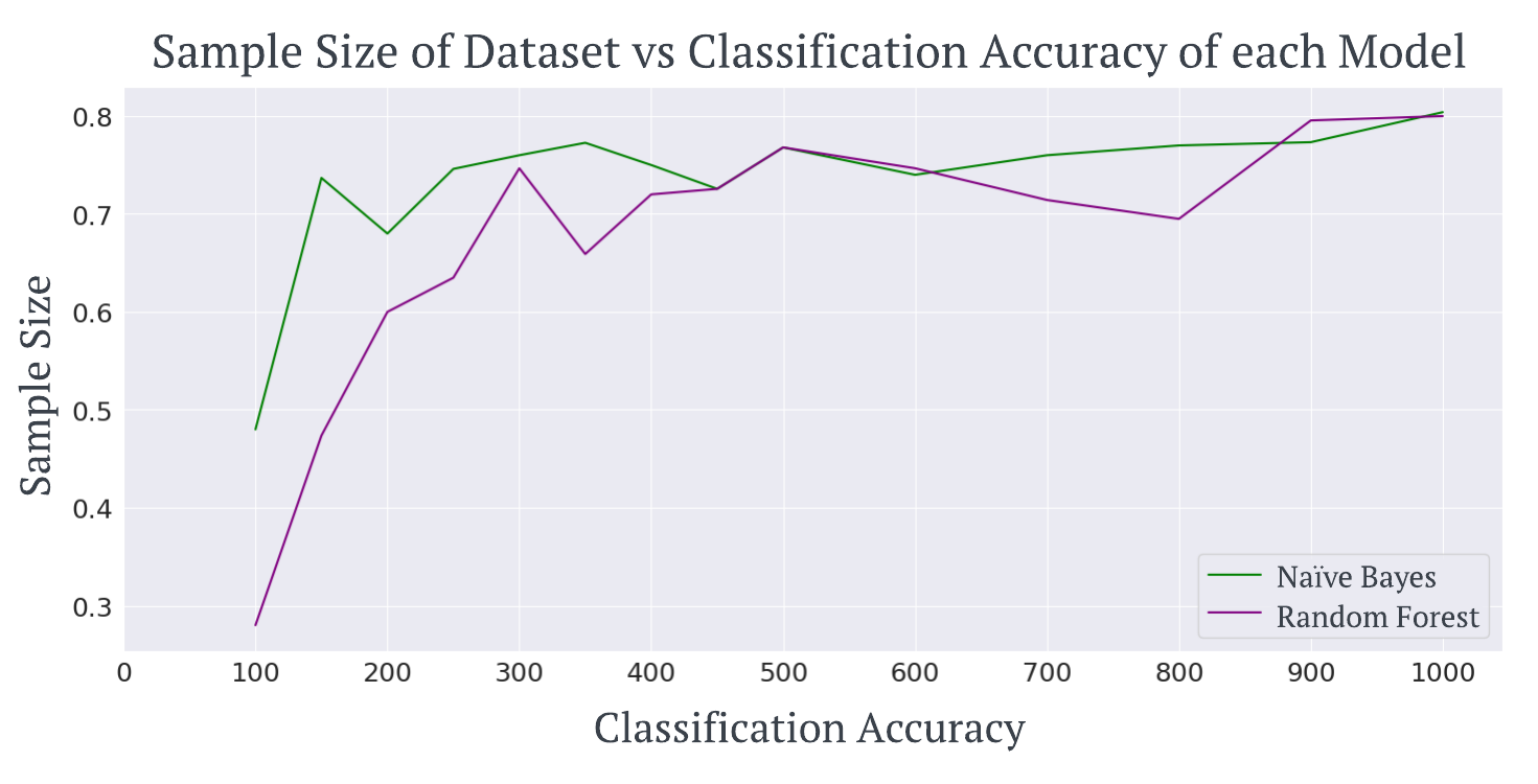 The first task to be completed on the data is to use ChatGPT to simplify the reviews. At the time of writing, ChatGPT is yet to implement an API feature to automate inputs. As a result, each prompt must be manually inputted. This makes using all 42,000 data points infeasible. Therefore, we try to find the Pareto optimal sample size to enable the use of a smaller dataset whilst also considering the classification accuracy of models, as they need enough data to train on. Samples of 100-1000 data points were split into train and test sets, and the classifier was built. Once predictions were made on the test set, the classification accuracy could be calculated. For this experiment, we have made use of two classifiers: Naïve Bayes and Random Forest classifier.