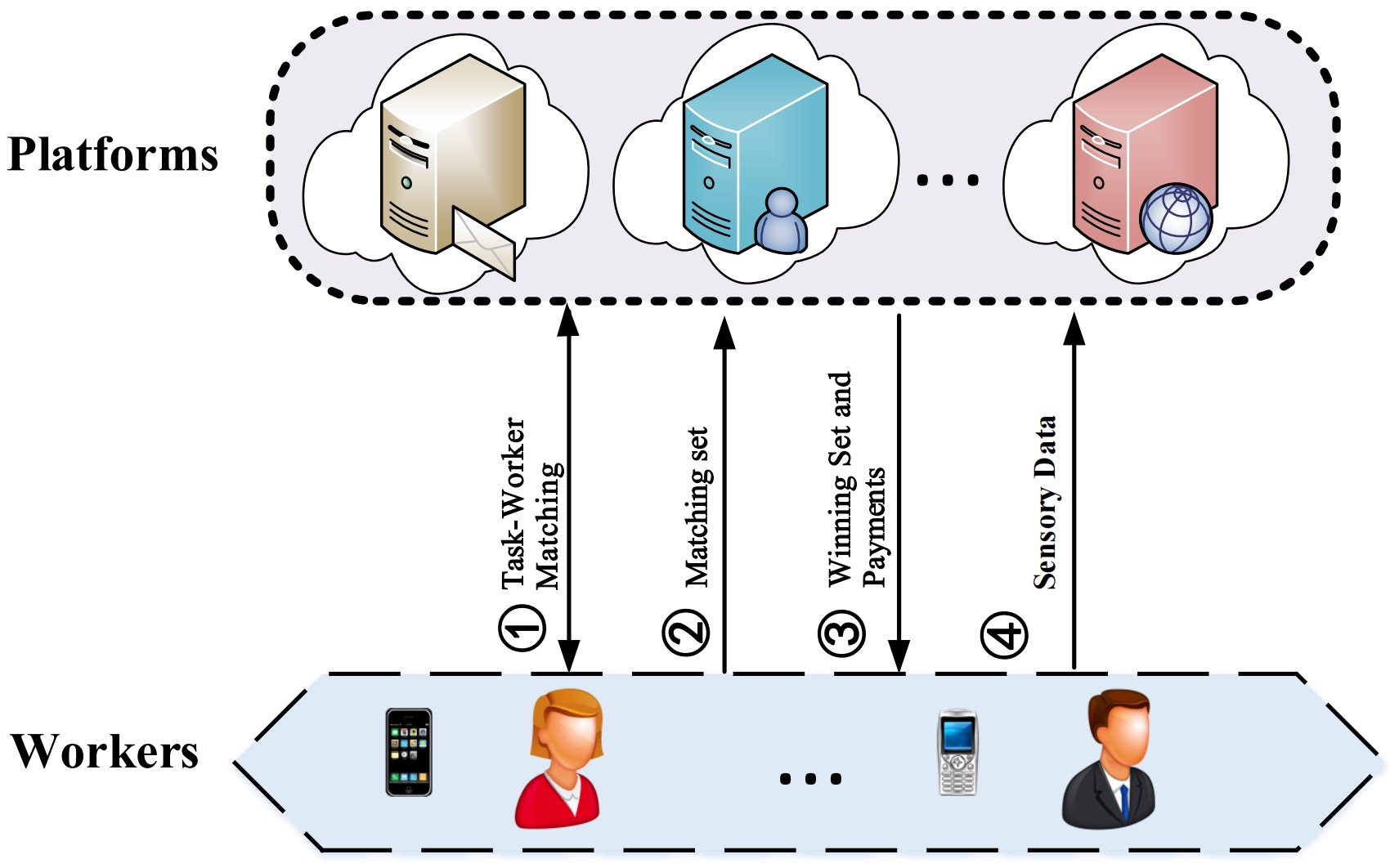 Fig. 1 provides an illustration of a typical MCS system, in which platforms enlist participating workers to execute tasks upon request from demanders (also referred to as task publishers). The success of the majority of MCS applications hinges on the willingness of an adequate number of mobile workers to partake in the process, thereby ensuring the provision of high-quality services. However, workers may exhibit hesitance towards participating in MCS, since task execution may drain their battery power, storage, computation, and communication resources. Furthermore, participating in MCS may render workers’ private information (including their location and bid details) vulnerable to exposure during data collection and exchange. To counterbalance these costs and safeguard their privacy, it is crucial to furnish workers with suitable incentives that do not jeopardize their confidentiality.