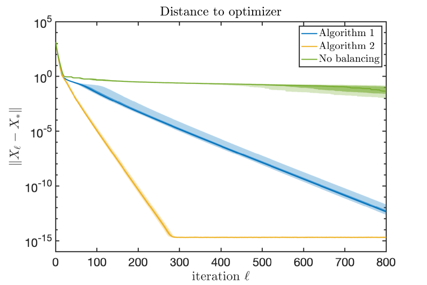 We report on the behavior of Algorithms 1 and 2 for and rank in the above setting. Each algorithm was started in the same set of 100 random initial points . We also included the results for a variant of Algorithm 1 without balancing, where line 4 in Algorithm 1 simply reads and .
