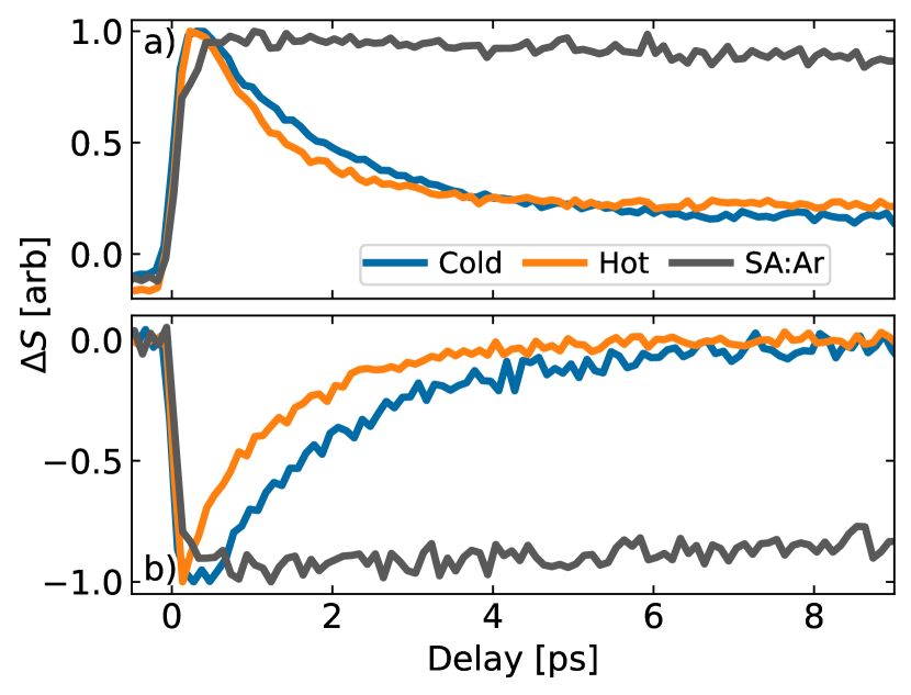 A full CE-TAS dataset for the SA:Ar system is shown in Fig. 6 with representative scans shown in Fig. 6a) and the full spectrum in Fig. 6b). Just as in the case of the individual lineouts discussed above, the entire spectrum decays with a significantly longer time constant than in the cold SA case above. Despite the slower decay, the initial rise time remains instrument response limited, indicating rapid ESIPT rates unaffected by the cluster environment.