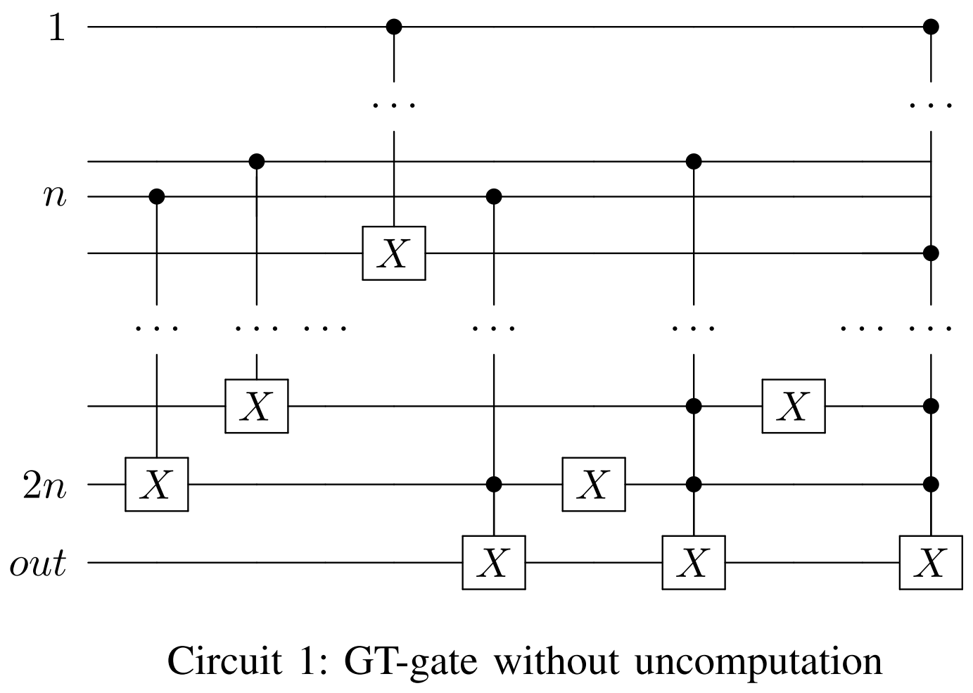 where . The last qubit carries the outcome of the comparison. The non-negative integers and are encoded bitwise in the first qubits and the remaining qubits, respectively. Note that the leading order bits have higher indices, i.e. they are located at lower positions in Circuit 1. The last two lines of (6) are for uncomputation.