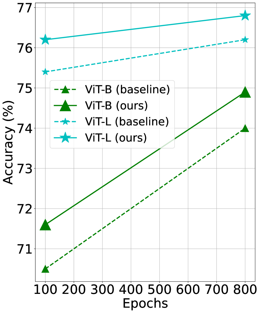 Effectiveness of AMCL under different backbones and training epochs. We evaluate model capacity using the ImageNet dataset. We choose ResNet-50 with three different hidden layer widths (width multipliers of , , and ), ViT-B, and ViT-L, which are widely used in SSL. In Fig. 4, under each epoch number, our AMCL yields consistent improvement to various backbones for SimCLR and CAN. Additionally, we observe that model capacity heavily depends on the choice of backbone. For ViT-L backbone encoder, SimCLR achieves the highest linear probe performance on ImageNet at . When combined with AMCL, accuracy of SimCLR further increases by .