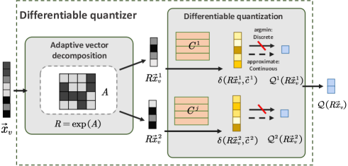Differentiable quantizer (§5). The differentiable quantizer consists of two steps: (1) adaptive vector decomposition and (2) differentiable quantization. Given an original -dimensional vector , it first automatically decomposes it into sub-vectors , of which every sub-vector has dimensions with balanced valuable information. Then, it converts each to a compact code in a continuous space via a differentiable transformation.