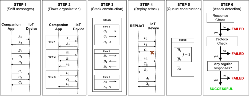 The attack consists of replaying the requests of each flow and storing the received responses (if any). The list of flows is organized as a stack so that the last flow will be the first to be replayed. The rationale behind this empiric design choice is that, for some devices, it may happen that, to trigger a specific function, several requests and responses (and then several flows) are exchanged. However, the first flows may not contain the actual command (that triggers the function) but just accessory information (e.g., the information needed to exchange some secret or synchronization messages). On the other hand, it is more likely that the actual command is contained in the last flows. Moreover, we observe that starting the attack by the first flow may change the state of the target device. Thus, when the tool replicates the flow containing the actual command, the attack may fail because of the state change of the device and not because of an effective countermeasure implemented on the device. However, being our tool device-agnostic there is a lack of prior knowledge about which specific flow contains the actual command. Hence the need to replicate all flows rather than solely focusing on the last one.