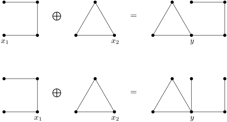 Different generalizations of the -sum have been introduced in varying contexts. One of these is called the clique-sum, the -clique-sum or the -sum, depending on the reference, and it is used, for example, in the proof of the Structure Theorem from Robertson and Seymour (2003) [22] on the structure of graphs for which no minor is isomorphic to a fixed graph . The idea of the -clique-sum, for a positive integer , is to first glue and together at a -clique, and then remove either no, all or some of the edges of this -clique in the new graph.