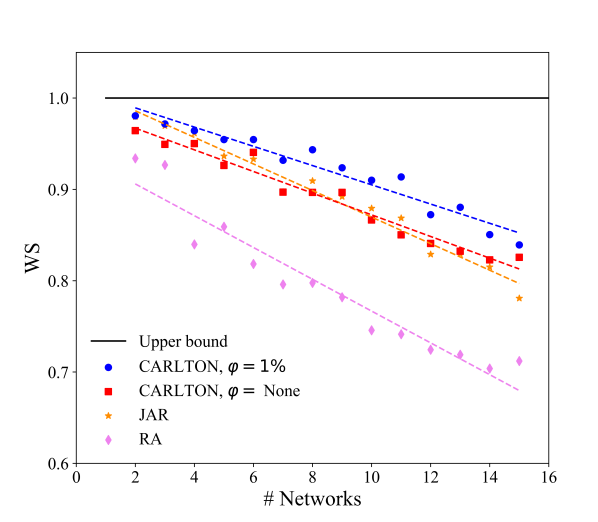 Finally, the obtained results unequivocally demonstrate the exceptional performance of CARLTON, even in scenarios where it was not explicitly trained on (i.e., , named out-of-sample), thereby highlighting its remarkable generality. This remarkable adaptability can be attributed to the underlying concept that scenarios with a high number of networks in certain constellations can be effectively represented by combinations of multiple scenarios involving a lower number of networks. Consequently, the agent exhibits cooperation not with all networks but rather selectively with a subset, likely comprising fewer than 7 networks, which are considered its neighboring networks. This premise elucidates the compelling rationale behind the observed excellent generality.