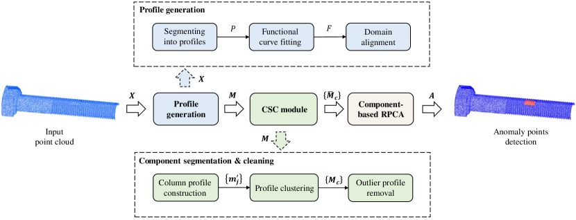 Our method consists of three major steps, which are Profile Generation, CSC Module, and Component-Based RPCA, respectively. Given a 3D point cloud with points, Section III-B first transforms it into a collection of profiles with similar shapes, where is the number of profiles and represents the number of points in each profile. To promote a low-rank representation and remove possible outliers of profiles, Section III-C utilizes the CSC model to segment into components , where each component . Finally, the RPCA algorithm is operated on each , stacking together into the final anomaly detection result of the input point cloud, as discussed in Section III-D. The overview of our approach is illustrated in Fig. 3.