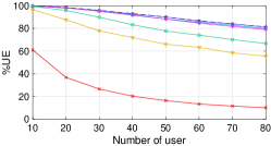 Then, the PF of the served users is written by . We aim to maximize the PF that specializes in prioritized service scheduling. PF accounts for both the total network throughput and the number of served users as the logarithm operation prevents the network throughput from being concentrated on a few number of users. However, sum-rate maximization prioritizes a user with the greatest spectral efficiency, not considering the fairness of service. Then the number of served users inevitably decreases when we target to maximize the sum-rate.