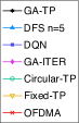 In all cases, the DQN scheme shows comparable results with the GA-TP and DFS but fails to exceed the PF of the DFS scheme. The main reason is that the DFS scheme benefits from the analytical optimal reward of the sub-trajectory, but the DQN scheme should estimate the exact reward of each position for all .