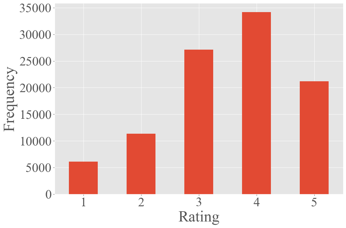 We used two public rating datasets, namely the MovieLens 100K111https://grouplens.org/datasets/movielens/100k/ and SUSHI preference222https://www.kamishima.net/sushi/ datasets. The MovieLens 100K dataset contains 100,000 ratings for 1,682 movies from 943 users on a scale of 1 to 5. The SUSHI preference dataset contains ratings for 100 sushi items from 5,000 users, where each user rated 10 sushi items on a scale of 0 to 4. For reference, Figure 2 shows the frequency distributions of ratings in these datasets.