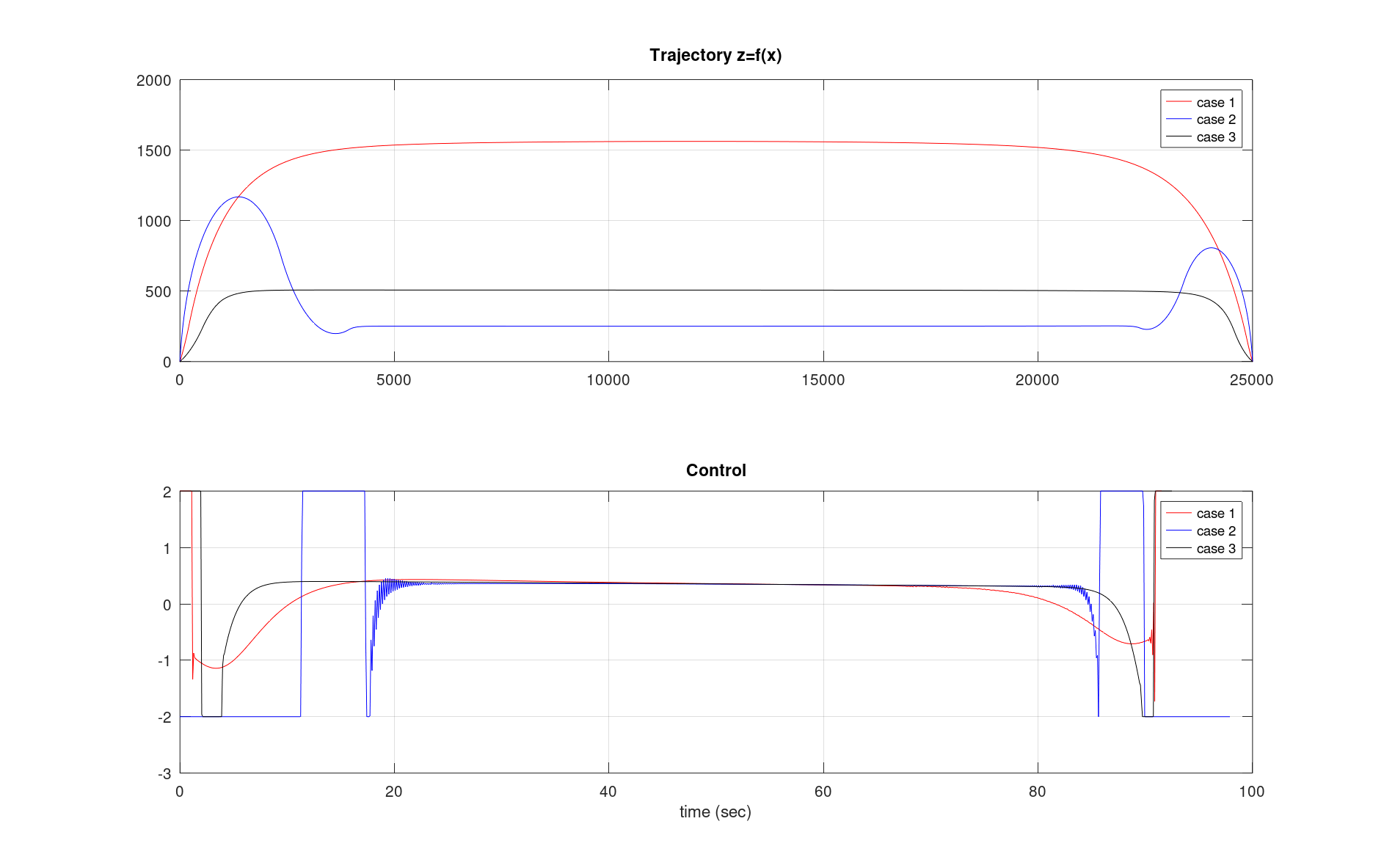 The continuation step was set to the value and the regularization coefficient to . We highlight here that lower values of regularization parameter slow down significantly (or make fail) the algorithm. We infer that this observation is based on the following fact: when is “too low”, then the central (level flight) arc becomes “too close” to a singular arc (that is along which the linearized system is not controllable, see definition 2). In this situation, it is well known that the continuation fails (see for instance Theorem 3 of [11] for deeper expanations). Consequently, can be considered as a “singular perturbation” in our optimal control problem. For deeper justification, please refer for instance to [3].