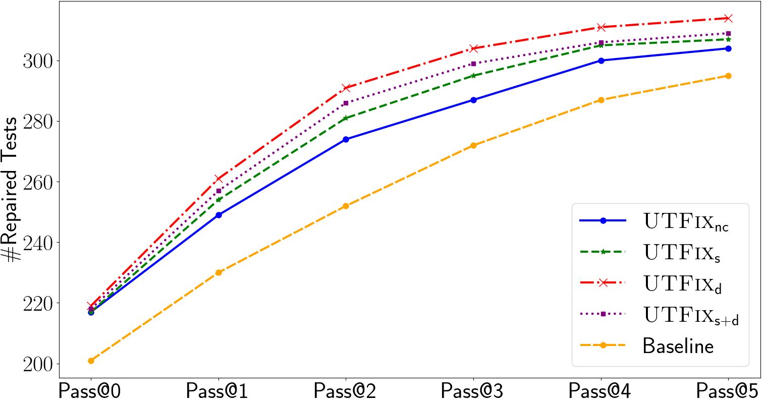 Figure 10 shows that all four UTFix techniques (with different colors) achieve nearly identical results at Pass@0, with 217, 217, 219, and 218 tests repaired. However, this number varies when static or dynamic slices are incorporated into the feedback. Specifically, the feedback with dynamic slices (marked in red) is the most effective, repairing 42 tests at Pass@1, compared to 39, 37, and 32 with UTFixs+d, UTFixs, and UTFixnc, respectively. We find that UTFix with dynamic slices outperforms the other settings, repairing a total of 314 out of 352 test failures (89.2% tests). In comparison to the Baseline, UTFix consistently performs better, as the Baseline repairs a maximum of 295 test failures.