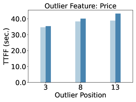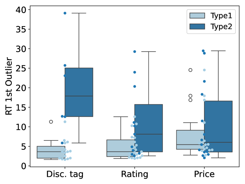 Moreover, we see in Figure 1 how the RT distribution of the two outlier variants differ for Task I. As expected, the plots show a higher RT for all features, and both outliers. However, it is interesting to note that we observe the lowest relative effect on the price ( increase), compared to star rating () and discount tag (). We relate this to the visual nature of discount tag and star ratings. Reducing the color contrast of discount tag would have a greater impact on the user’s ability to detect it among the distractors, compared to a different price ranges as the user still has to carefully check the prices to detect the outlier. Regarding the accuracy we see no drop, suggesting that even a more subtle deviation in observable feature can be detected by many users.